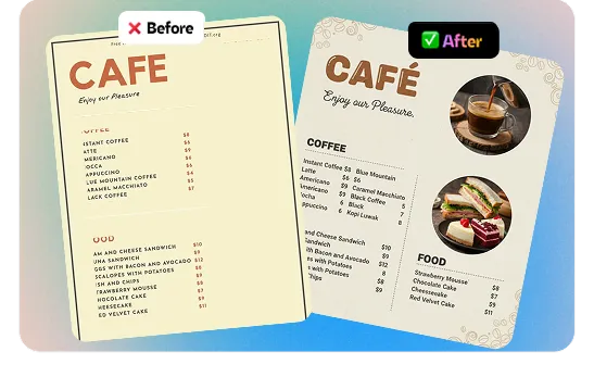 Make every menu item, promotion, and marketing material look professionally designed. Create compelling visuals that drive foot traffic and increase local market share without designer budgets.