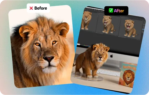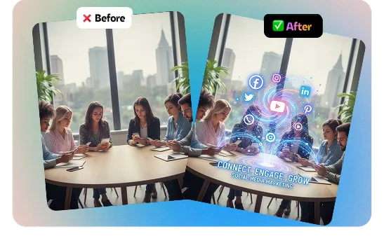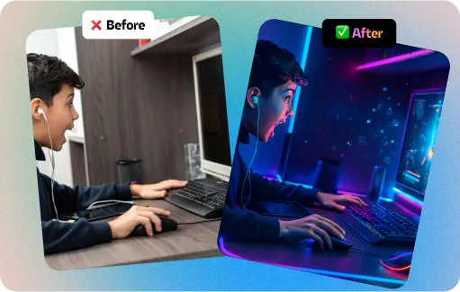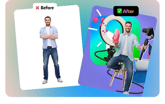 Remove backgrounds instantly or swap them for something better. The AI automatically adjusts lighting and shadows so everything looks natural and professional. No more awkward cutouts that obviously came from cheap editing tools.