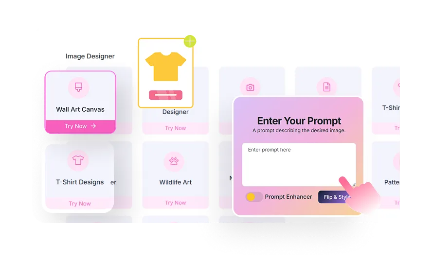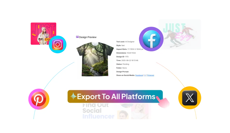 Transform one design idea into dozens of profitable products. Generate T-shirt designs, seamless patterns, colorway variants, and instant mockupsall with print-ready 300DPI quality that sells.